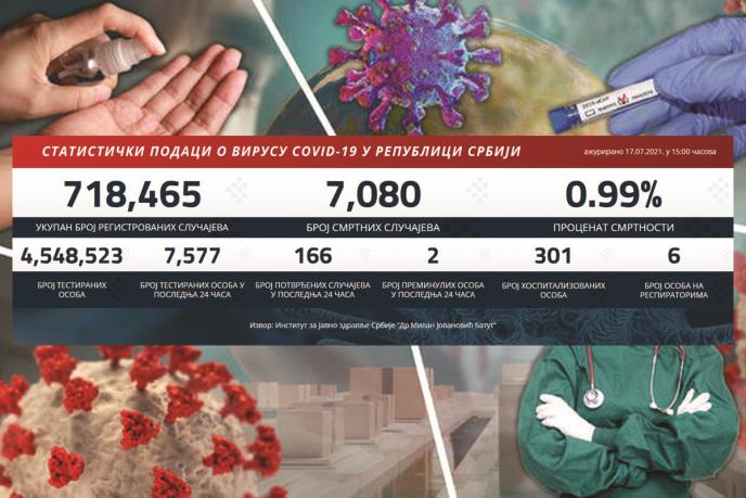 U prethodna 24 sata u Srbiji je na korona virus testirano 7.577 građana od kojih je 166 novozaraženih.