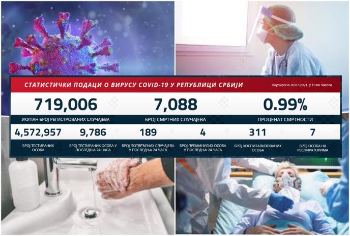 U prethodna 24 sata u Srbiji je na korona virus testirano 9.786 građana od kojih je 189 novozaraženih.