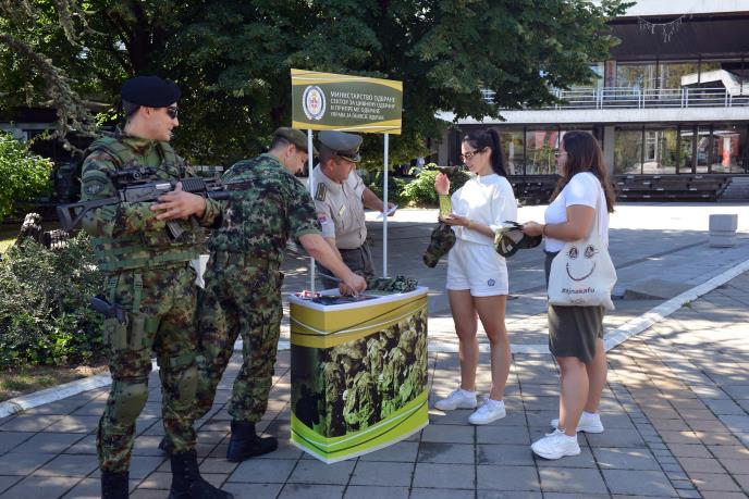 Na štandu Ministarstva odbrane i Vojske Srbije na Gradskom trgu u Valjevu danas su zainteresovani mladići i devojke imali priliku da se informišu o svim pojedinostima dobrovoljnog služenja vojnog roka, a oni koji su već doneli odluku da pristupe Vojsci Srbije, mogli su da popune prijavu na konkurs i započnu proceduru.