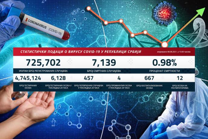 U prethodna 24 sata u Srbiji je na korona virus testirano 6.128 građana, a 457 je novozaraženo.