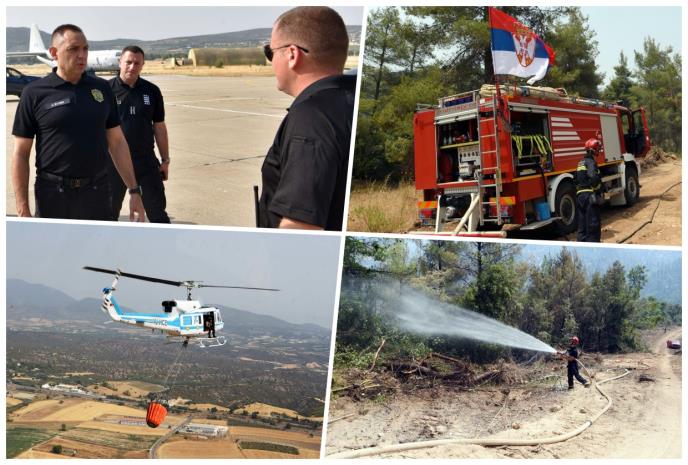 Ministar unutrašnjih poslova Aleksandar Vulin obišao je danas pripadnike Sektora za vanredne situacije koji se na grčkom ostrvu Evija zajedno sa kolegama neustrašivo bore da savladaju požare koji su zahvatili ovo ostrvo.