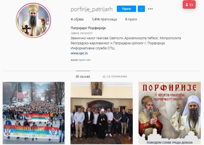 Na društvenoj mreži Instagram danas je otvoren zvaničan nalog NJegove Svetosti Arhiepiskopa pećkog, Mitropolita beogradsko-karlovačkog i Patrijarha srpskog gospodina Porfirija.