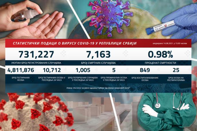 U prethodna 24 sata u Srbiji je na korona virus testirano 10.712 građana, a 1.005 njih je novozaraženo.