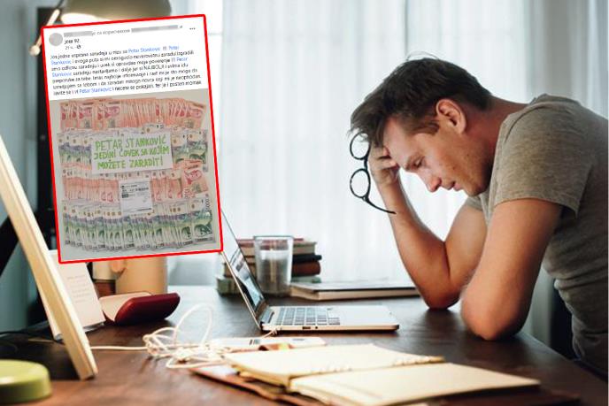 U njoj je označeno čak 80 ljudi čiji su Fejsbuk prijatelji pozvani da uplate novac i tako „zarade" „Još jedna uspešna saradnja sa Petar Stanković! Petar Stanković, i ovog puta si mi omogućio neverovatnu zaradu! Izgradili smo odličnu saradnju i uvek si opravdao moje poverenje! Saradnju nastavljamo i dalje jer si najbolji i svima idu preporuke za tebe. Imaš najbolje informacije i čast mi je što mogu da sarađujem sa tobom i da zaradim mnogo novca koji mi je neophodan. Javite se Petru i nećete se pokajati, fer je i pošten momak“, napisano je uz fotografiju gomile novca na stolu.