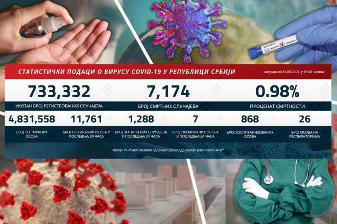 U prethodna 24 sata u Srbiji je na korona virus testirano 11.761 građanin, a njih 1.288 je novozaraženih.