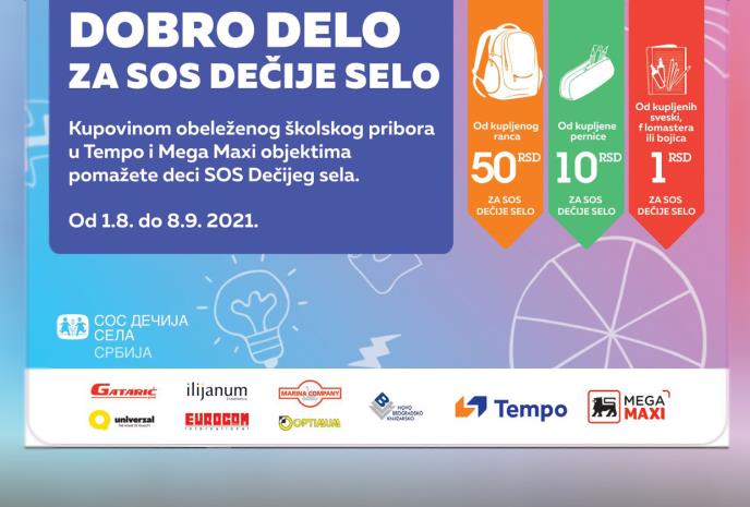 Početak školske godine prate mnoge radosne aktivnosti, kako za one najmlađe koji tek kreću u školu tako i za one starije osnovce i srednjoškolce. Jedna od njih je svakako i priprema potrebnog školskog pribora, a užitak u nabavci novih rančeva, svezaka, pernica još je veći kada znamo da na taj način istovremeno pomažemo i drugima. Zato i ove godine sve kupce u Tempo i Mega Maxi hipermarketima očekuje veliki izbor školskog pribora, uz povoljne cene i dodatna sniženja, a prilikom nabavke određenih artikala iz ovog asortimana kupci imaju i priliku da pruže doprinos tradicionalnoj humanitarnoj akciji „Dobro delo za SOS Dečije selo“.