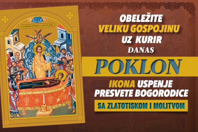 Srpska pravoslavna crkva i njeni vernici danas obeležavaju Veliku Gospojinu, jedan od najvećih hrišćanskih praznika posvećen vaznesenju presvete Bogorodice. Tim povodom, danas ćete uz dnevne novine Kurir dobiti na poklon ikonu USPENIJE PRESVETE BOGORODICE sa zlatotiskom i molitvom.