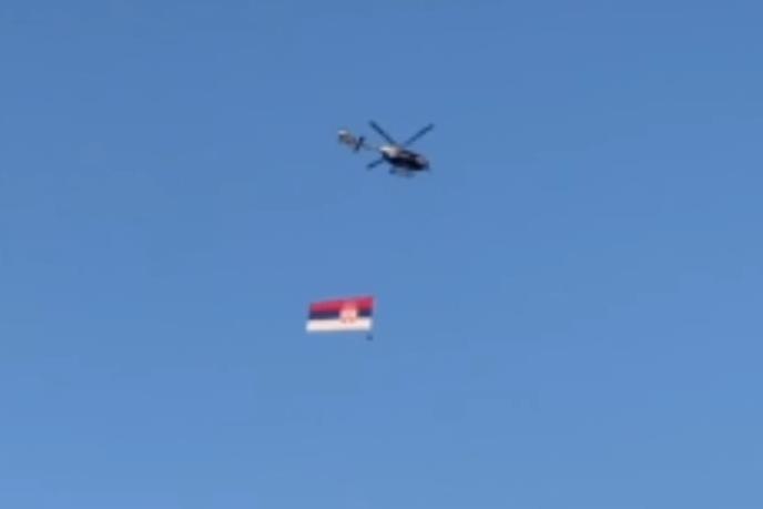 Pripadnici Helikopterske jedinice i jutros su nad glavnim gradom uvežbavali nošenje srpske trobojke koju će na sutrašnjoj centralnoj manifestaciji povodom Dana zastave nositi čak tri helikoptera HJ MUP-a.