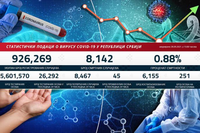 Preminulo je 45 pacijenata, a na respiratorima u bolnicama širom Srbije nalazi se 251 obolelih.