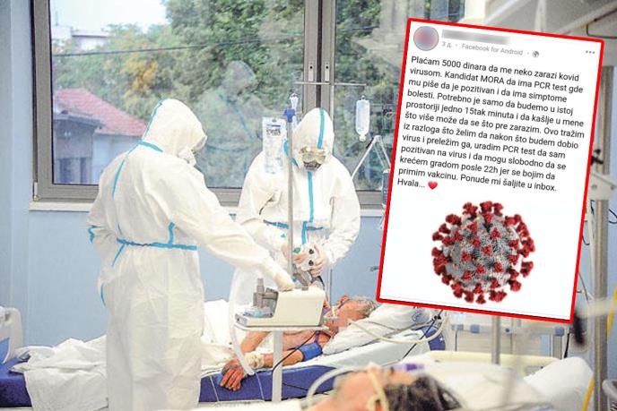"Plaćam 5.000 dinara da me neko zarazi kovid virusom. Kandidat mora da ima PCR test gde mu piše da je pozitivan i da ima simptome bolesti. Potrebno je samo da budemo u istoj prostoriji jedno 15-ak minuta i da kašlje u mene što više može da se što pre zarazim.