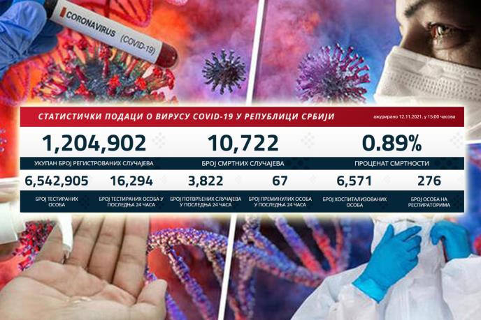 Preminulo je 67 pacijenata, a na respiratorima u bolnicama širom Srbije nalazi se 276 obolelih.
