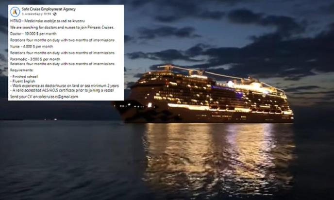 U oglasu agencije "Sejf kruz implojment" (Safe Cruise Employment Agency) piše da se traže doktori koji bi radili na kruzeru "Princes kruzis" (Princess Cruises) za 10.000 dolara, medicinske sestre koje bi radile za 4.800 dolara i bolničari koji bi imali platu 3.500 dolara mesečno.