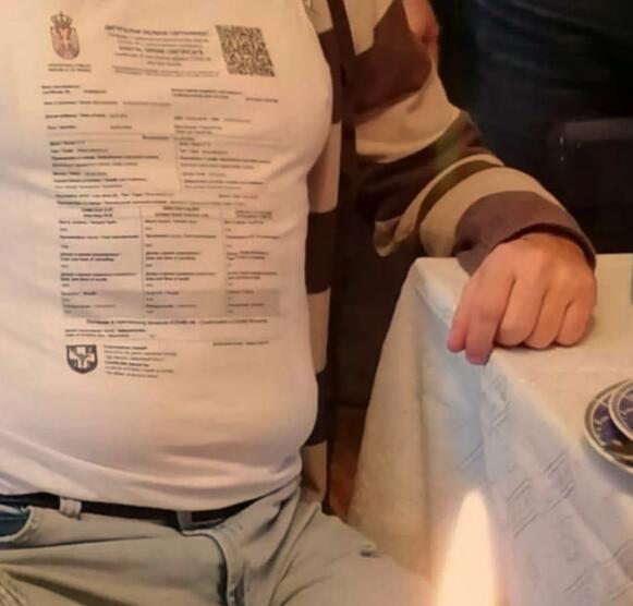 Ali, ovaj čovek rešio se da se rastosilja svih ovih muka! Svoju kovid propusnicu odštampao je na majicu i svi lepo mogu da vide kada je i šta primio od vakcina, tj. kada se od korone lečio. A QR kod, ogroman, može da se skenira i iz aviona.