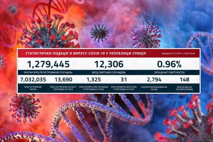 BEOGRAD - U prethodnih 24 sata na korona virus testirano je 13,690 građana od kojih je 1.325 novozaraženih.