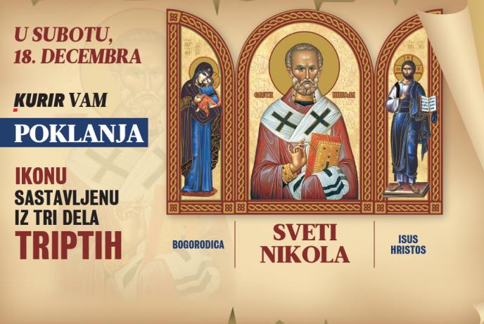 Srpska pravoslavna crkva i vernici u nedelju, 19. decembra, slave Svetog Nikolu Čudotvorca, jednog od najvećih hrišćanskih svetitelja, koji važi za zaštitnika putnika, moreplovaca, ribara i splavara. Dan uoči slave Kurir vam poklanja ikonu sastavljenu iz tri dela – triptih– na kojoj se nalaze Bogorodica, Sveti Nikola u centralnom delu i Isus Hristos.