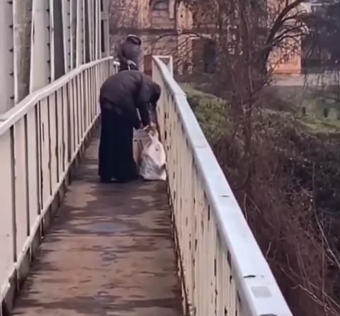 Na snimku se vidi kako ta osoba stoji na sred mosta i iz kese mirno vadi đubre koje potom u nekoliko navrata baca u reku naočigled prolaznika.