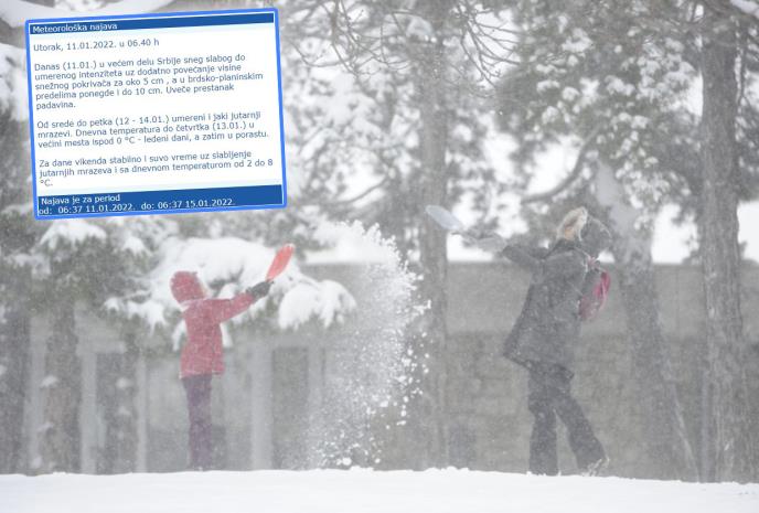 Danas u većem delu Srbije padaće sneg slabog do umerenog intenziteta uz dodatno povećanje visine snežnog pokrivača za oko 5 cm, a u brdsko-planinskim predelima ponegde i do 10 cm. Uveče prestanak padavina. Jutarnja temperatura od minus četiri do jedan, najviša dnevna od minus dva do dva stepena.