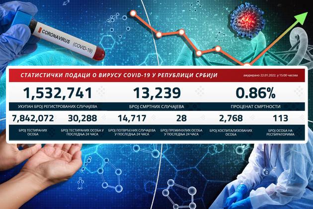 U poslednja 24 sata u Srbiji je na korona virus testirano 30,288 osoba, od kojih je pozitivno njih 14,717 dok je, nažalost, osoba preminulo 28.