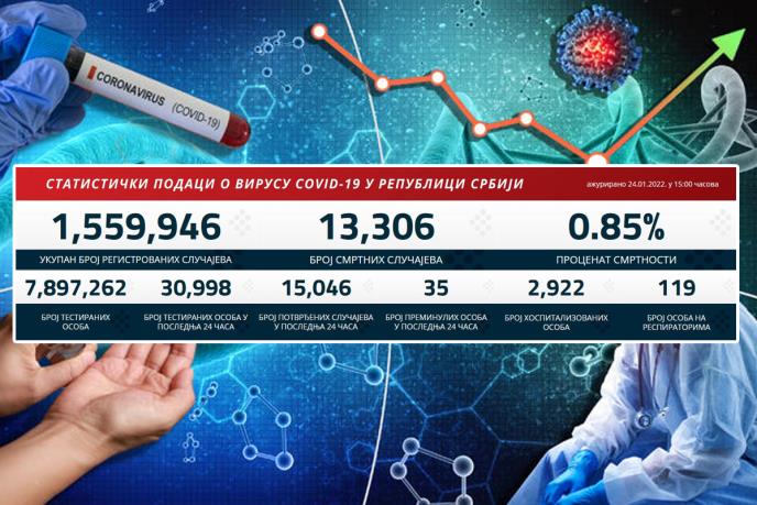 U poslednja 24 sata u Srbiji je na korona virus testirano 30.998 građana, od kojih je pozitivno 15.046 dok je, nažalost, preminulo 35.