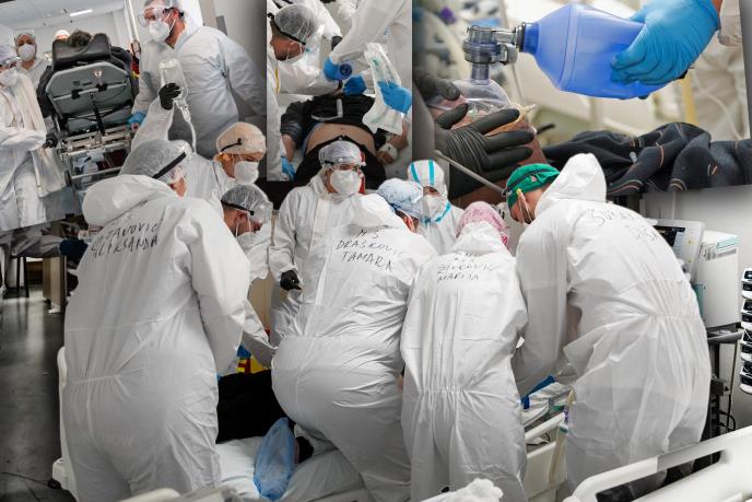 Oko jednog kreveta gomila skafandera. Trče, creva na sve strane. Saturacija pala na 63, "haj flou" više ne pomaže - mora na respirator. Prvi korak NIV - s velikom pripijenom maskom preko celog lica.