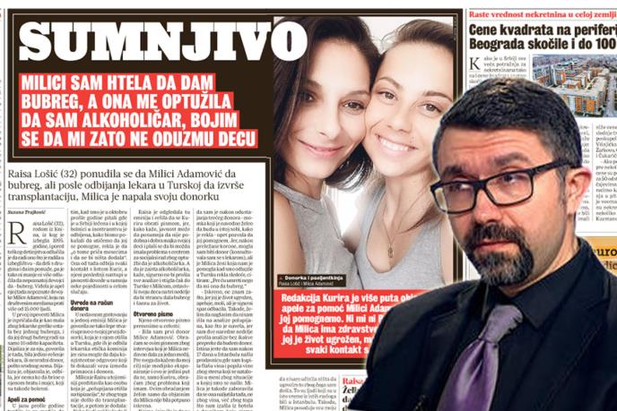 Međutim, sada se pojavila priča Raise Lošić, koja tvrdi da je htela da Milici donira bubreg, ali kako kaže, bolesna devojka ju je nakon prvobitnog dogovora optužila da je alkoholičar i napala.