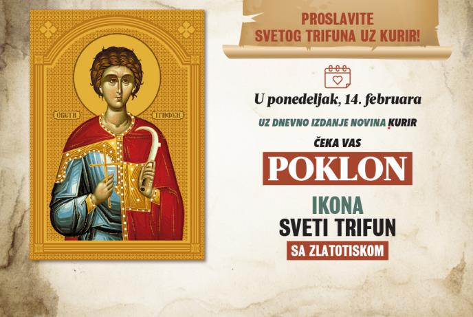 Srpska pravoslavna crkva i svi njeni vernici u ponedeljak, 14.februara, slave Svetog Trifuna, zaštitnika vinogradara, bračne ljubavi i vernosti. Dnevne novineKurir poklanjaju ikonu sa zlatotiskom i molitvom.