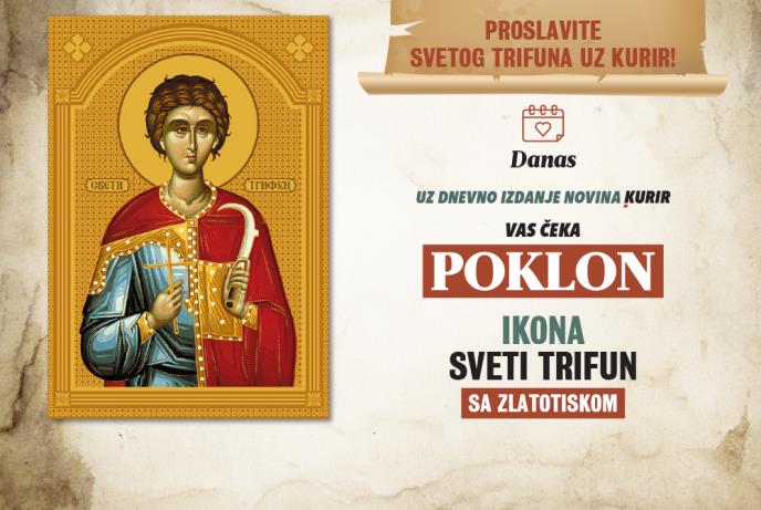 PROSLAVITE SVETOG TRIFUNA UZ KURIR! NE PROPUSTITE DANAS POKLON IKONA SVETI TRIFUN SA ZLATOTISKOM I MOLITVOM