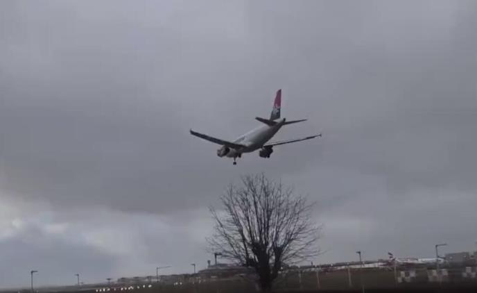 Putnički avion "Er Srbije" koji je juče leteo za London, pri sletanju na aerodrom Hitrou upao je u veliku oluju koja besni širom zapadne Evrope.