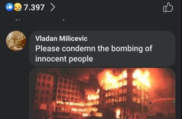 - Sinoć sam na nekoliko sajtova u Americi, Britaniji i Australiji okačio slike bombardovanja i zamolio narod da to osudi, što su oni i učinili. Na kraju prije nego što su me obrisali sam im se zahvalio i napisao da su to slike kada su oni 1999. bombardovali Srbiju - objavio je na svom Fejbuk profilu Vladan Milićević.