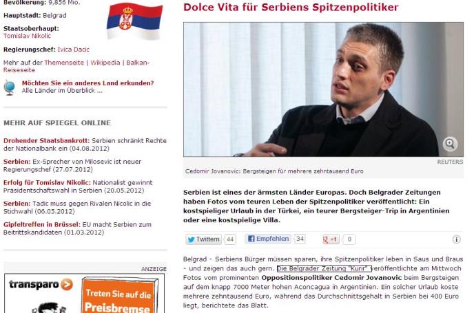 Tekst pod ovim naslovom, sa informacijama koje je Kurir otkrio, objavio je ugledni nemački časopis Špigl. U tekstu se kaže da je Srbija jedna od najsiromašnijih zemalja u Evropi, ali da su beogradski listovi objavili fotografije koje pokazuju skupi život političkih lidera, od skupih odmora u Turskoj, preskupog planinarenja do luksuznih vila i stanova u kojima žive.