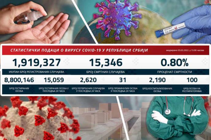 U prethodnih 24 sata u Srbiji je na korona virus testirano 15.059 građana od kojih je 2.620 novozaraženih.