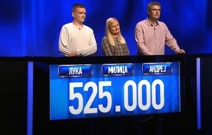 Na samom kraju, zahvaljujući hrabrom potezu mladića, takmičari su uspeli da daju 13 tačnih odgovora, tri puta vrate tragača za korak unazad i odnesu kući 525.000 dinara.