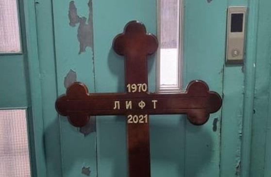 Duhovita i pomalo sablasna fotografija koju je napravio stanar pomenute zgrade Dejan, prikazuje drveni krst s natpisomi: "Lift (1970-2021)".