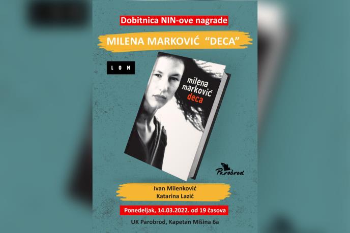 Milena Marković, 61. dobitnica ovogodišnje književne NIN-ove nagrade, uz Ivana Milenkovića, člana NIN-ovog žirija, predstaviće nagrađen rukopis ’’Deca’’ ( Lom, Beograd, 2021) u ponedeljak, 14.marta od 19 časova u Parobrodu. Roman poema ili roman u stihu, posložen metodom asocijacija (uredili Flavio Rigonat i Zvonko Karanović), sadrži elemente celokupnog dosadašnjeg stvaralaštva Milene Marković. Strategijama sećanja, pamćenja i zaborava, u tvorbi identiteta svakog pojedinca/pojedinke sa ovih prostora, ključno je pitanje kojim se Marković bavi, pišući o ’’Deci’’... Završnica njene hibridne strukture, sa jedinim interpunkcijskim znakom-tačkom, je mirno upozorenje, kako ocenjuje dr Dubravka Bogutovac, upućeno ’’Deci’’, tj. svakom čitaocu ovog poetsko- teatralno-ritualnog teksta: ’’...živi uči gledaj praštaj i nemoj ništa zaboraviti. ’’