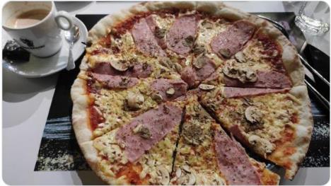 Kako i sami možete videti, na prvu loptu ništa neobično ne upada u oko, pica sa sirom, šunkom i pečurkama, pravilno isečena u tanjiru, pored se nazire čaša s vodom i šoljica kafe s mlekom.