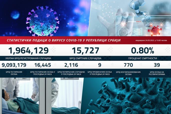 U prethodna 24 sata u Srbiji je na korona virus testirano 16.445 građana od kojih je 2.116 novozaraženih.