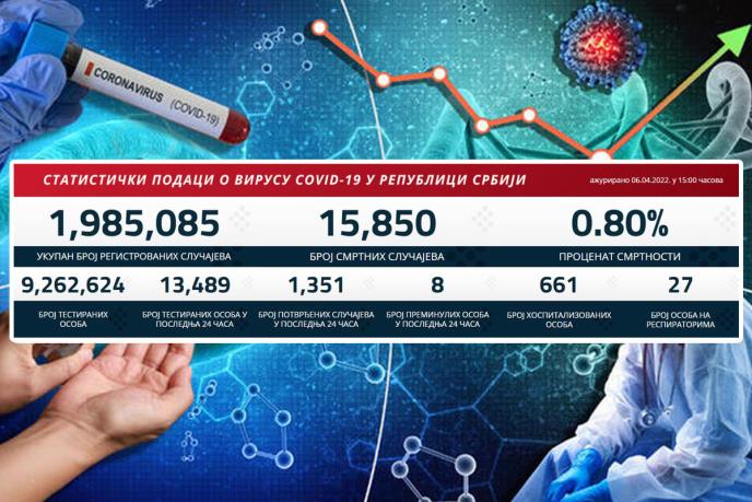 U prethodna 24 sata u Srbiji je na korona virus testirano 13.489 građana od kojih je 1.351 novozaražen.