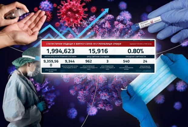 U prethodna 24 sata u Srbiji je na korona virus testirano 9.344 građana od kojih je 962 novozaražen.