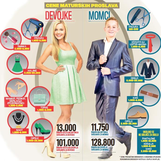Ni odela nisu mnogo jeftinija, pa će muški deo učenika morati da odvoji minimum 50 evra. Kada se tome doda i kupovina košulje, cipela, kravate i kaiša, svečani izgled za proslavu mature, najskromniji mladići će platiti oko 130 evra. Minimalni iznos koji će i momci i devojke morati da izdvoje za novu obuću je oko 30 evra.