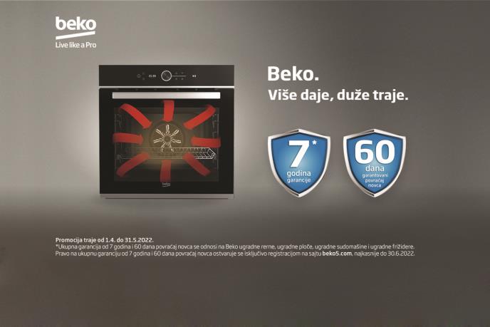 Ostvarićete čak 7 godina garancije i mogućnost povraćaja sredstava nakon 60 dana, ako je proizvod neoštećen tokom trajanja akcije do 31. maja. Sve što je potrebno jeste da registrujete vašu kupovinu na: https://www.beko5.com/ do 30.06.2022. Zašto izabrati Beko?