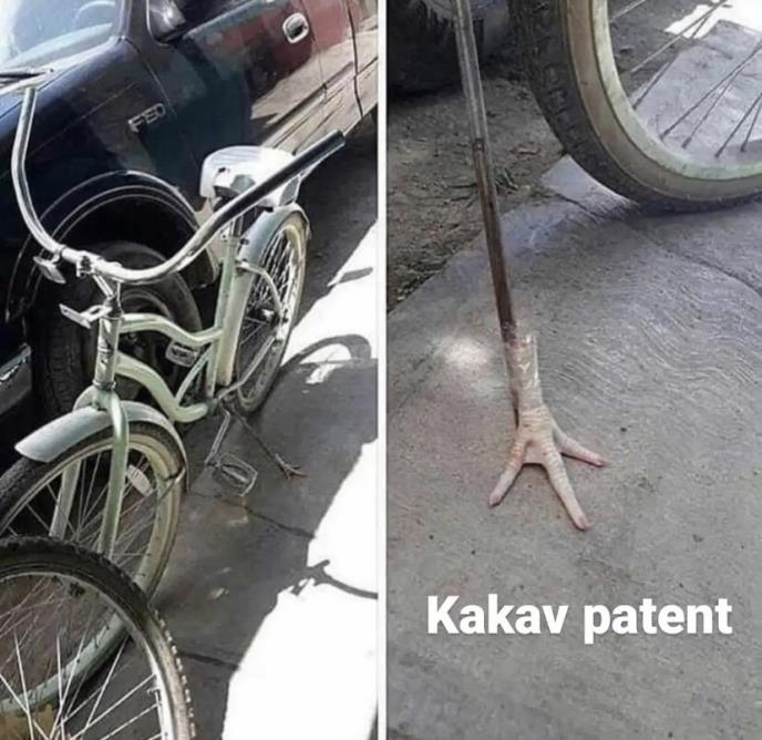 Naime, ovo je čovek čije je prevozno sredstvo bicikl, a nogica od bicikla mu očigledno nije bila dovoljno pa je stavio umesto nje pileću nogicu, oblepivši je selotejpom.