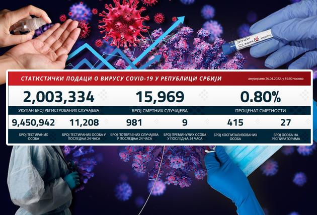 U prethodnih 24 sata u Srbiji je na korona virus testirano 11.208 građana od kojih je 981 novozaražen.