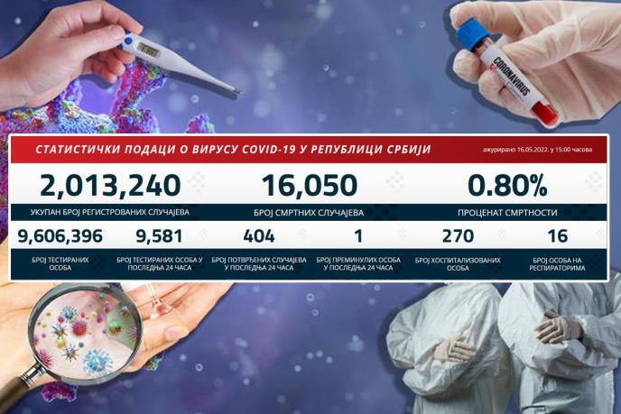 U prethodna 24 sata u Srbiji je na korona virus testirano 9.581 građanin od kojih je 404 novozaraženih.