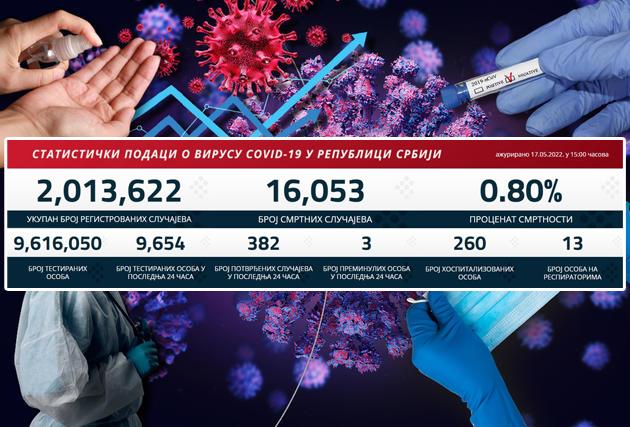 U prethodna 24 sata u Srbiji je na korona virus testirano 9.654 građana od kojih su 382 novozaražena.