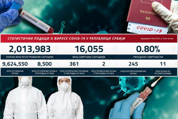 U prethodna 24 sata u Srbiji je na korona virus testirano 8.500 građana od kojih je 361 novozaraženi.