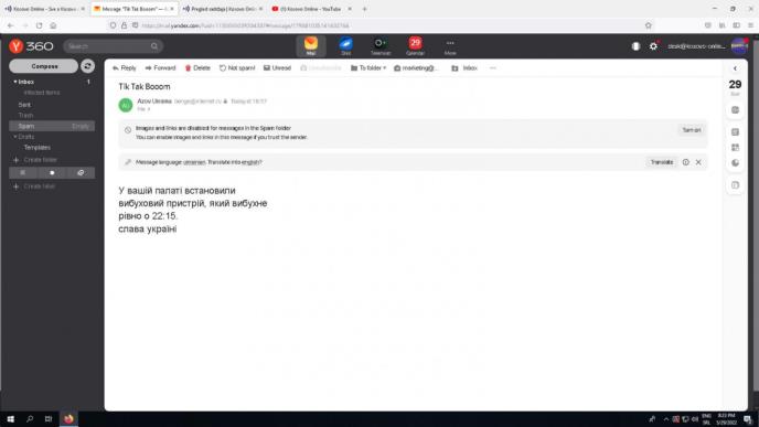 "U vašim prostorijama postavljena je eksplozivna naprava koja će eksplodirati tačno u 22:15. časova. Slava Ukrajini", navedeno je u pomenutom mejlu koji je napisan na ukrajinskom jeziku.