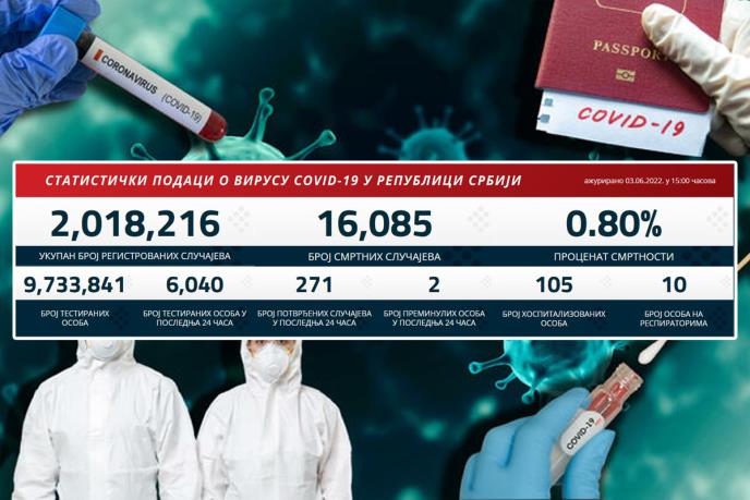 Korona virus je u poslednja 24 sata potvrđen kod 271 osoba, a istovremeno su od posledica ove bolesti preminula dva pacijenata.