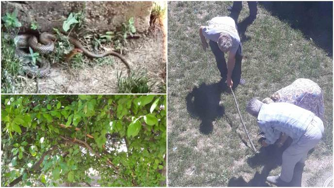 U dvorištu OŠ "Pavle Savić" u Mirijevu prvo su zaposleni uspeli da bezbedno uhvate jednog smuka i stave u džak dok su čekali Zoo-higijenu. A onda su primetili da je drugi na drvetu