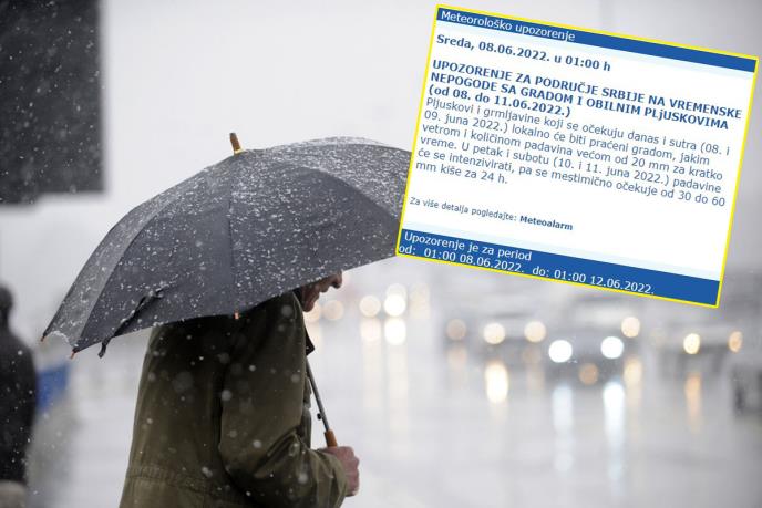 Inače, RHMZ je objavio novo upozorenje za grmljavinske nepogode. Plјuskovi i grmlјavine koji se očekuju danas i sutra lokalno će biti praćeni gradom, jakim vetrom i količinom padavina većom od 20 mm za kratko vreme. U petak i subotu padavine će se intenzivirati, pa se mestimično očekuje od 30 do 60 mm kiše za 24 h.