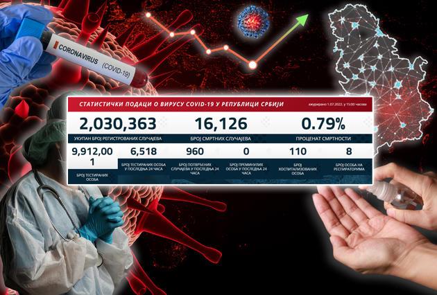 U poslednja 24 sata registrovano je 960 slučaja zaraze korona virusom od testiranih 6.518 uzoraka.